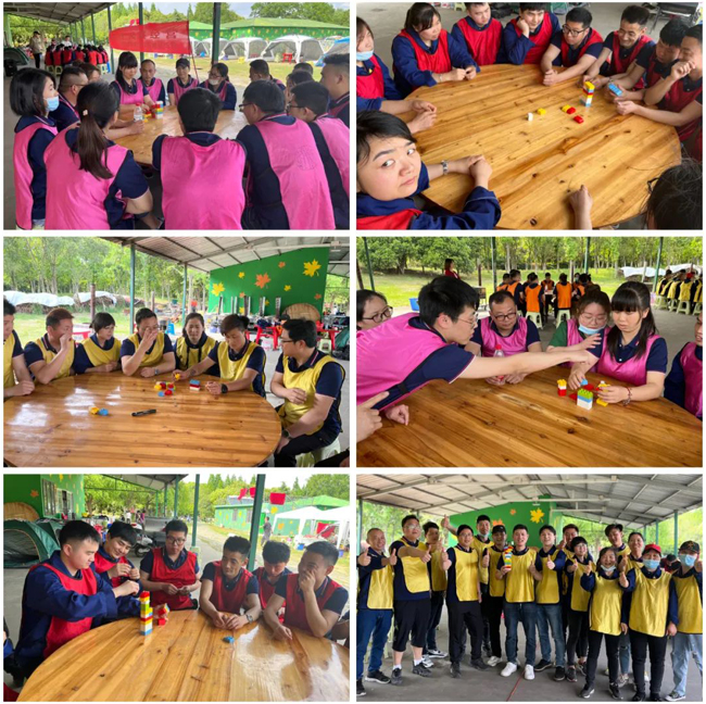 這個游戲的規則是教練員給每個隊都放一些積木,在給四個隊分別發一些小紙條,小紙條只能自己看,不能給別人看,也不能說話,隊員們要根據紙條的提示來了解自己擔任的角色以及任務,筑塔員可以動手筑塔,其他人筑塔算犯規,筑塔員要根據隊員們的手勢提示,來完成筑塔。
